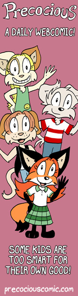 Note: If you would like me to have an original Precocious strip on hand for you, please let me know. I may not bring the originals binder to ConnectiCon, as I discovered I lacked table space for it at AC. Precocious originals are $75 and Copper Road originals range up to $120 depending on size and complexity. I will provide protective sleeves and backing boards for them. Otherwise, everyone has to wait until the store system gets set up and pay the extra shipping and handling costs.